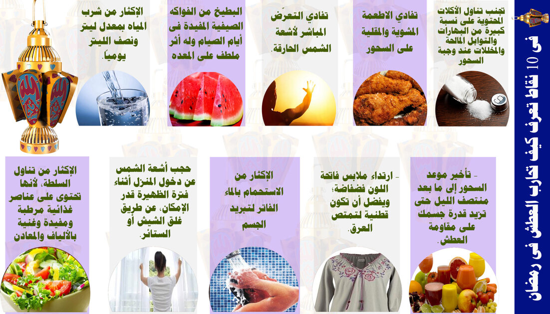 يعاني الصائم من شدة الجوع والعطش خلال نهار رمضان، ومع قدوم شهر رمضان متزامناً مع فصل الصيف زادت حدة الجوع والعطش حيث اجتمعت حرارة الصيف مع قلة الماء بسبب الصيام، مما زاد من نسبة العطش لدى الصائم، فنجد الصائمين وربات البيوت يبحثون عن اكلات للسحور تمنع الاحساس بالعطش، أو تخفف من حدة العطش، فهناك الكثير من الأطعمة التي تحفظ الرطوبة في الجسم وتقلل الاحساس بالعطش منها على سبيل المثال : اللبن الزبادي، والبرتقال، والفول المدمس، والحمص، والعدس، والتين، والتمر، والبيض، والمكسرات، والخضار والفواكه، وفي هذا فهرس سنقدم لكم اكلات للسحور تمنع العطش، كي تكون حاضرة على مائدة السحور.