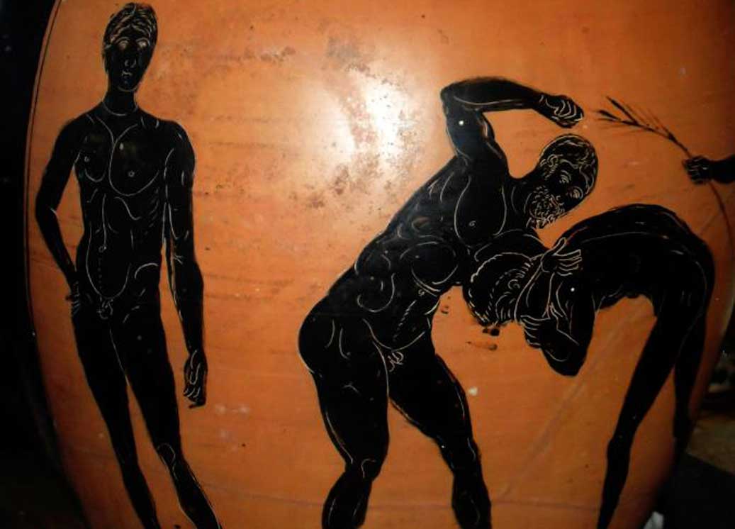 وكانت من أهم الرياضات في الألعاب الأولمبية القتالية اذ تضمنت الملاكمة والمصارعة معاً وابرزت المهارات القتالية والقوة للاعبين. واردى الملاكمين قفازات رقيقة من الجلد و قاتلوا في ساحات مفتوحة مما جعل حصار الخصم في الزاوية مستحيلاً و اطال مدة النزال. واذا ما طالت مدة القتال طويلاً قد يقبل المنافسين حسمها بضربات مباشرة لا تصد من الخصم مما ادى احياناً الى الموت المفاجئ. ولم يكن هناك تقسيم للاعبين حسب الوزن فعادة كان يفوز الاكثر وزناً.