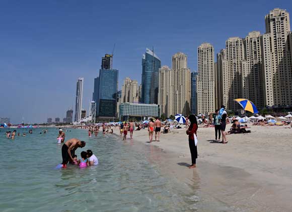 والجمعة، جلست مئات العائلات ومجموعات من الشبان والشابات على الشواطئ البيضاء قبالة مياه الخليج في دبي، يلهون ويستمعون إلى الموسيقى تحت أشعة الشمس وخلفهم ناطحات السحاب التي تشتهر بها المدينة.