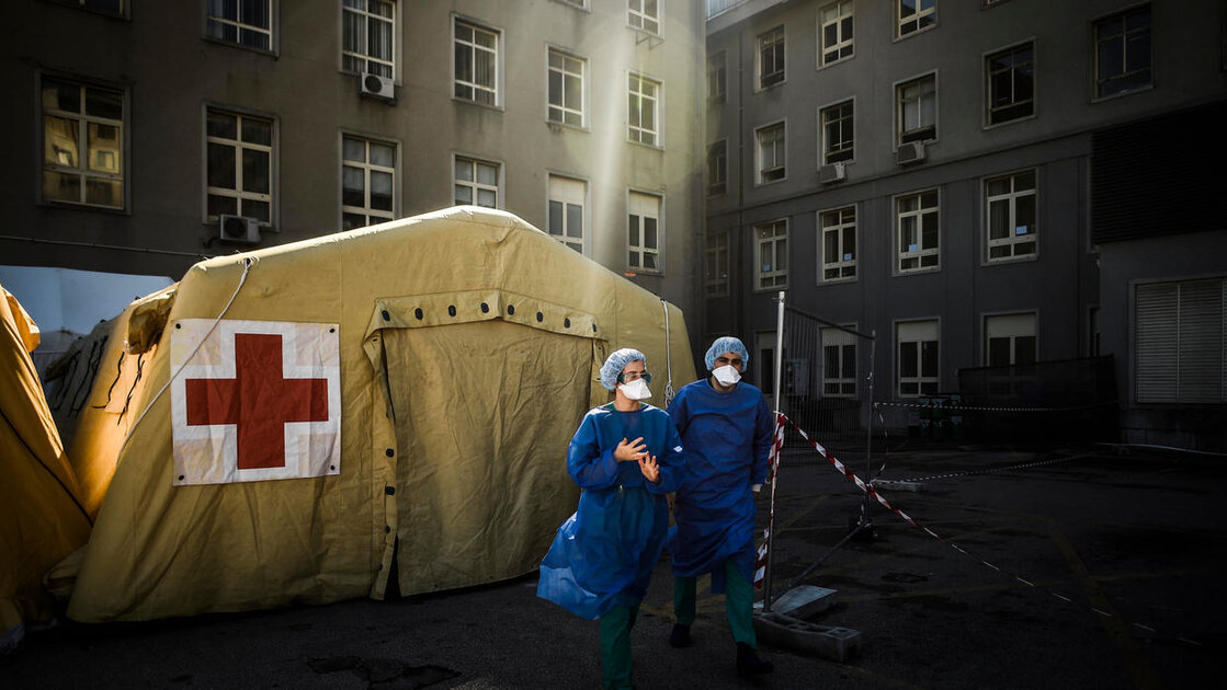 خيمة يتمّ فيها "فرز" المصابين بكورونا المستجدّ أمام مستشفى سانتا ماريا دو لشبونة في البرتغال في 2 نيسان/أبريل 2020