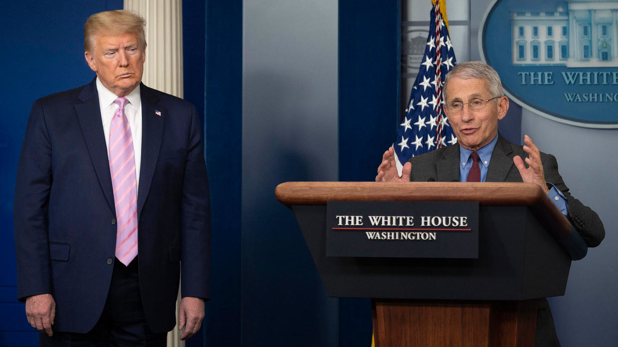 الرئيس الأميركي دونالد ترامب (يسار) يستمع فيما مدير المعهد الوطني للأمراض المعدية أنتوني فاوتشي يتكلم خلال المؤتمر الصحافي اليومي حول فيروس كورونا المستجد في البيت الأبيض في 10 نيسان/أبريل 2020