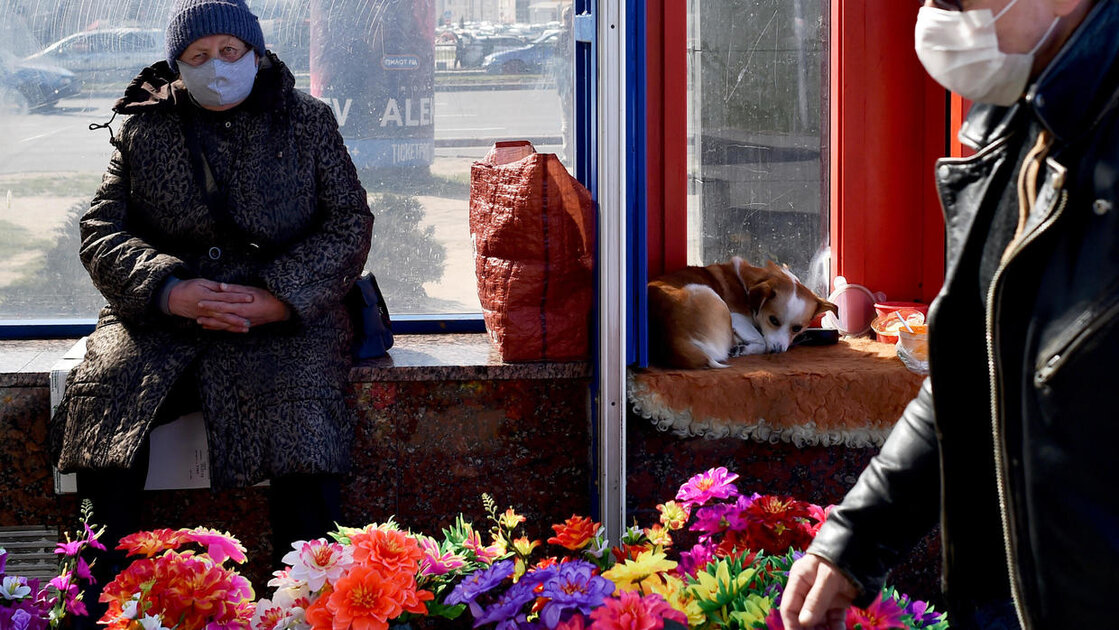 بائعة ورود بلاستيكية تضع كمامة واقية في مينسك، بيلاروسيا، 11 نيسان/ابريل 2020.