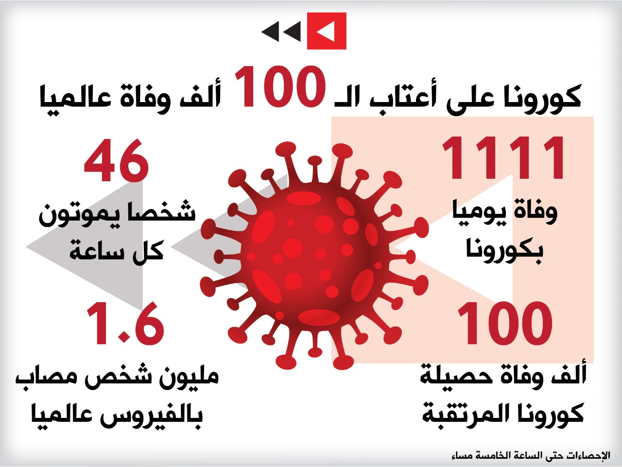 وحتى ظهر الجمعة، بلغت إصابات كورونا حول العالم أكثر من مليون و619 ألفا، وتجاوزت الوفيات 97 ألفا، بينما وصل عدد المتعافين لنحو 365 ألفا.