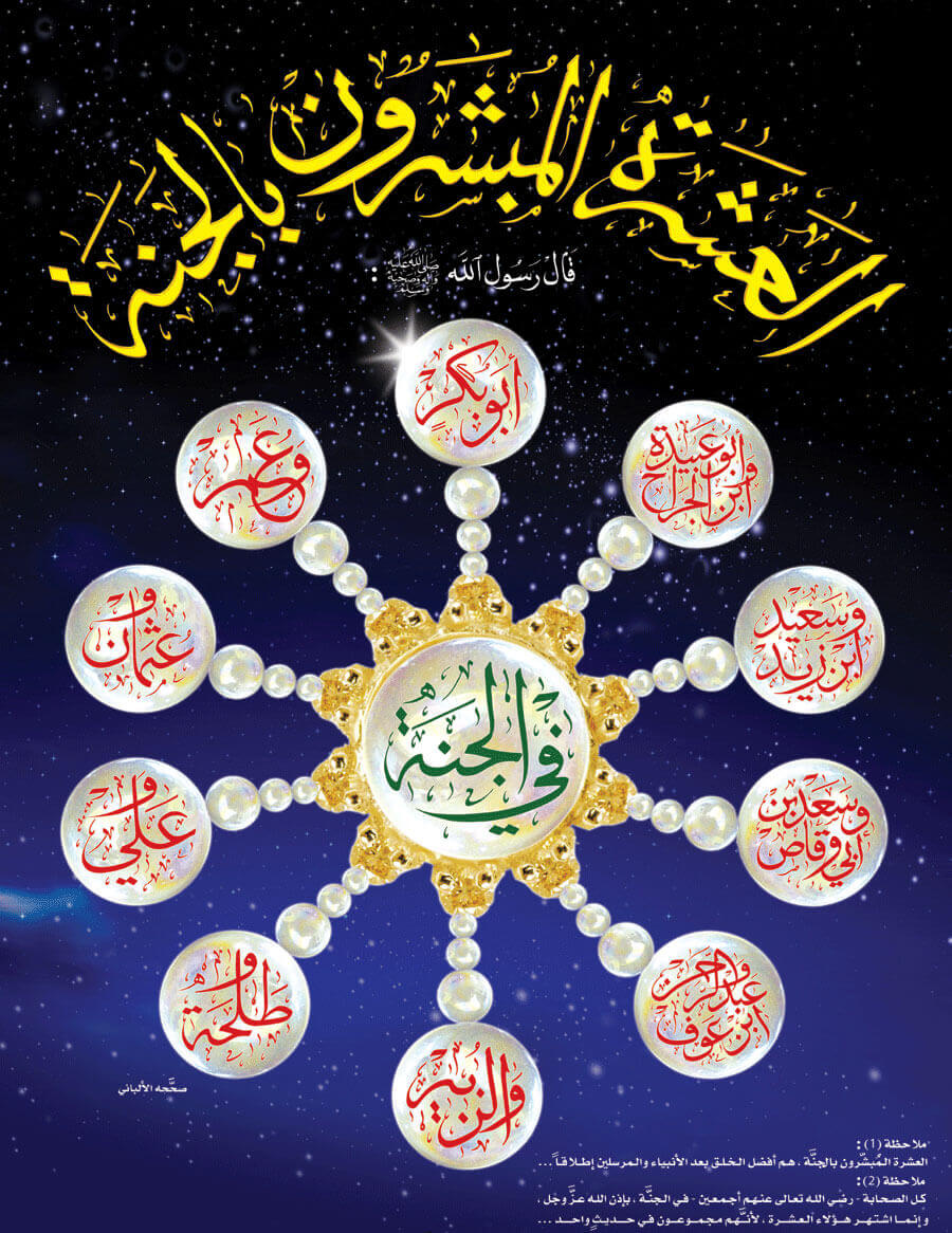 العشرة المبشّرون بالجنّة هم أصحاب النبي صلى الله عليه وسلم المذكورون في الحديث الذي رواه عَبْد الرَّحْمَنِ بْن عَوْفٍ قَالَ (قَالَ رَسُولُ اللَّهِ صَلَّى اللَّهُ عَلَيْهِ وَسَلَّمَ أَبُو بَكْرٍ فِي الْجَنَّةِ وَعُمَرُ فِي الْجَنَّةِ وَعُثْمَانُ فِي الْجَنَّةِ وَعَلِيٌّ فِي الْجَنَّةِ وَطَلْحَةُ فِي الْجَنَّةِ وَالزُّبَيْرُ فِي الْجَنَّةِ وَعَبْدُ الرَّحْمَنِ بْنُ عَوْفٍ فِي الْجَنَّةِ وَسَعْدٌ فِي الْجَنَّةِ وَسَعِيدٌ فِي الْجَنَّةِ وَأَبُو عُبَيْدَةَ بْنُ الْجَرَّاحِ فِي الْجَنَّةِ) . رواه الترمذي 3680 وسعد هو ابن أبي وقاص وسعيد هو سعيد بن زيد ، وهناك عدد غيرهم من الصحابة قد بُشّر بالجنّة كخديجة بنت خويلد وعبد الله بن سلام وعكاشة بن محصن وغيرهم ولكن إنما سمي أولئك بالعشرة المبشرين بالجنّة لأنّ تبشيرهم جاء في حديث واحد ، والله أعلم. تعالوا نتعرف عليهم… العشرة المبشرين بالجنة هم: