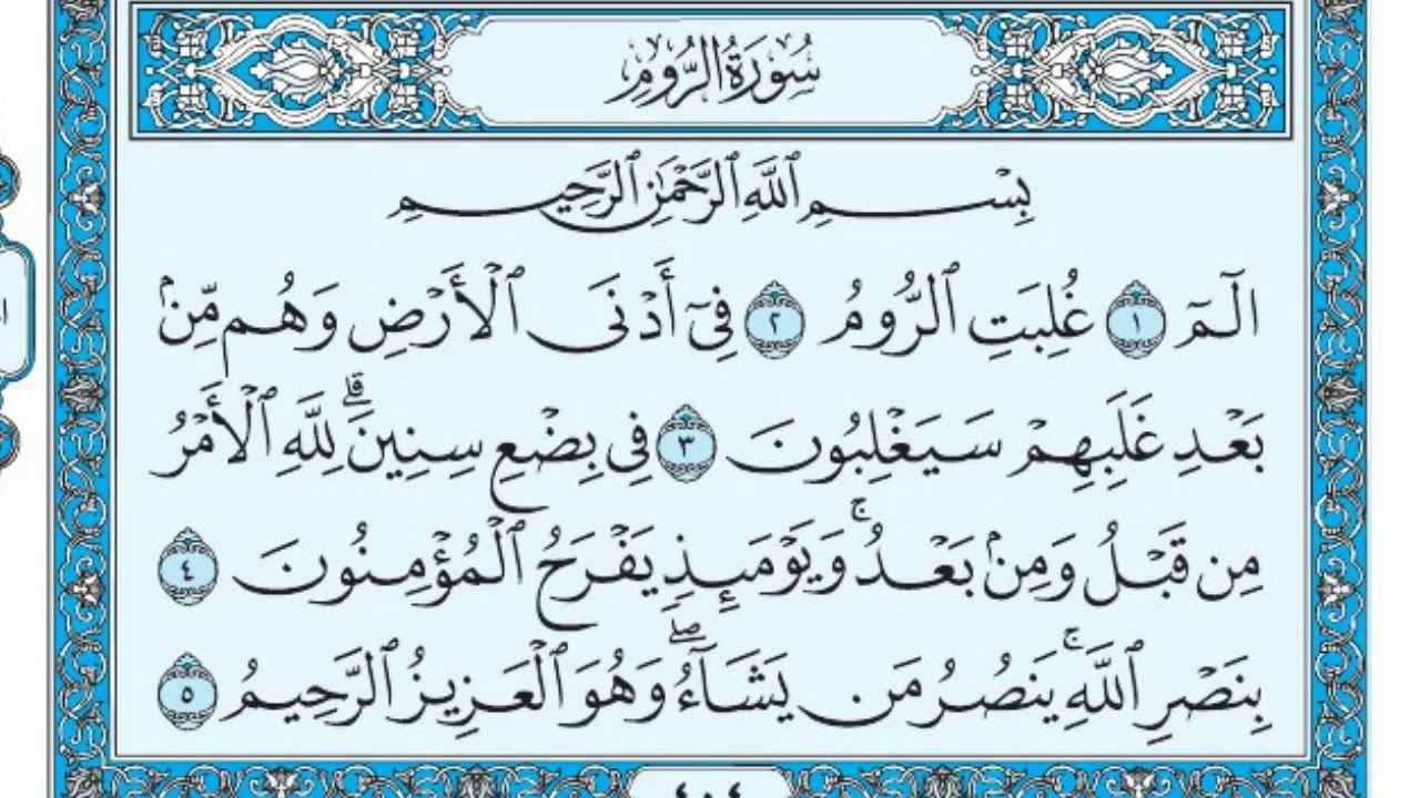 يقول الله سبحانه وتعالى في بداية سورة الروم بسم الله الرحمن الرحيم : ” الٓمٓ (١) غُلِبَتِ ٱلرُّومُ (٢) فِىٓ أَدۡنَى ٱلۡأَرۡضِ وَهُم مِّنۢ بَعۡدِ غَلَبِهِمۡ سَيَغۡلِبُونَ (٣) فِى بِضۡعِ سِنِينَۗ لِلَّهِ ٱلۡأَمۡرُ مِن قَبۡلُ وَمِنۢ بَعۡدُۚ وَيَوۡمَٮِٕذٍ يَفۡرَحُ ٱلۡمُؤۡمِنُونَ (٤) بِنَصۡرِ ٱللَّهِۚ يَنصُرُ مَن يَشَآءُۖ وَهُوَ ٱلۡعَزِيزُ ٱلرَّحِيمُ (٥) وَعۡدَ ٱللَّهِۖ لَا يُخۡلِفُ ٱللَّهُ وَعۡدَهُ وَلَـٰكِنَّ أَڪۡثَرَ ٱلنَّاسِ لَا يَعۡلَمُونَ (٦) يَعۡلَمُونَ ظَـٰهِرًا مِّنَ ٱلۡحَيَوٰةِ ٱلدُّنۡيَا وَهُمۡ عَنِ ٱلۡأَخِرَةِ هُمۡ غَـٰفِلُونَ (٧) أَوَلَمۡ يَتَفَكَّرُواْ فِىٓ أَنفُسِہِمۗ مَّا خَلَقَ ٱللَّهُ ٱلسَّمَـٰوَاتِ وَٱلۡأَرۡضَ وَمَا بَيۡنَہُمَآ إِلَّا بِٱلۡحَقِّ وَأَجَلٍ مُّسَمًّى وَإِنَّ كَثِيرًا مِّنَ ٱلنَّاسِ بِلِقَآىِٕ رَبِّهِمۡ لَكَـٰفِرُونَ (٨) أَوَلَمۡ يَسِيرُواْ فِى ٱلۡأَرۡضِ فَيَنظُرُواْ كَيۡفَ كَانَ عَـٰقِبَةُ ٱلَّذِينَ مِن قَبۡلِهِمۡۚ ڪَانُوٓاْ أَشَدَّ مِنۡہُمۡ قُوَّةً وَأَثَارُواْ ٱلۡأَرۡضَ وَعَمَرُوهَآ أَڪۡثَرَ مِمَّا عَمَرُوهَا وَجَآءَتۡهُمۡ رُسُلُهُم بِٱلۡبَيِّنَـٰتِۖ فَمَا كَانَ ٱللَّهُ لِيَظۡلِمَهُمۡ وَلَـٰكِن كَانُوٓاْ أَنفُسَہُمۡ يَظۡلِمُونَ (٩) ثُمَّ كَانَ عَـٰقِبَةَ ٱلَّذِينَ أَسَـٰٓـُٔواْ ٱلسُّوٓأَىٰٓ أَن ڪَذَّبُواْ بِـَٔايَـٰتِ ٱللَّهِ وَكَانُواْ بِہَا يَسۡتَهۡزِءُونَ (١٠) ” .