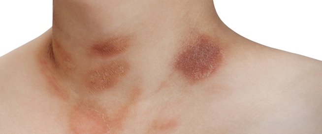 تكون البقع النموذجية محاطة بالقشور على شكل طوق (المقصود بذلك أن حواف القشور الداخلية تكون حرة، بينما تكون حوافها الخارجية ملاصقة للجلد).