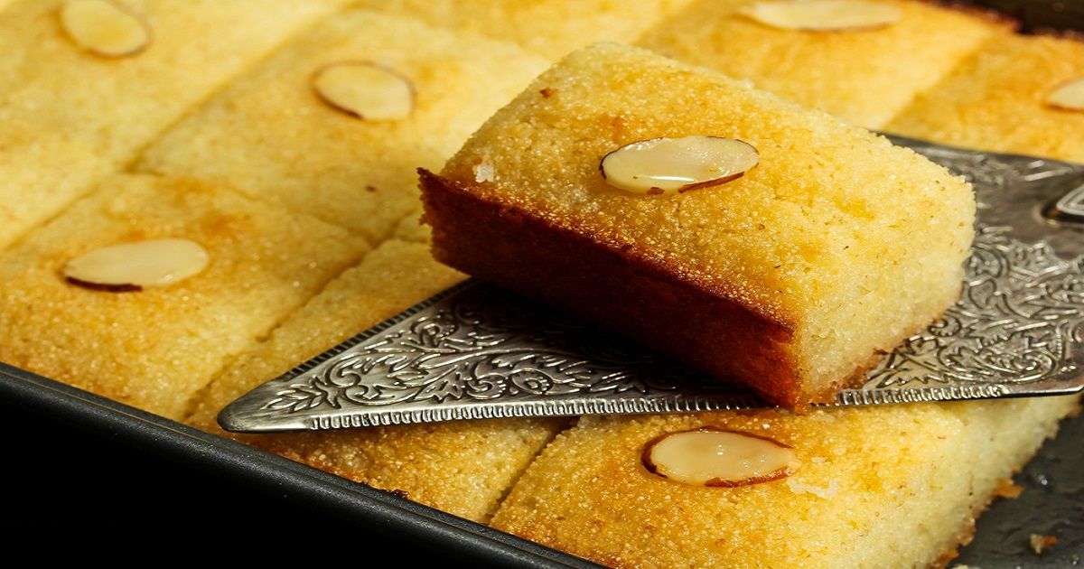 7- اسكبي البسبوسة في طبق التقديم لتزيني بها سفرتك.