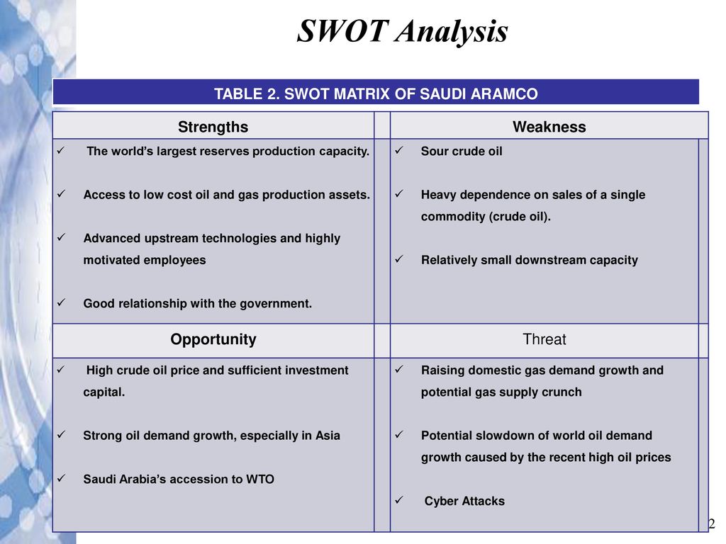 فيما يلي تحليل الوضع في أرامكو السعودية سيتم تحليله باستخدام نموذج SWOT الذي يعد وسيلة لتحليل البيئة الإدارية والتشغيلية للشركة، في المصفوفة سيتم تصنيف الموارد الداخلية للشركة التي لها تأثير إيجابي على الشركة على أنها “نقاط قوة” بينما سيتم تصنيف تلك الموارد الداخلية التي لها آثار سلبية على الشركة على أنها “نقاط ضعف”، والعوامل الخارجية التي لها تأثير إيجابي ستتم تسميتها على أنها “فرص”.