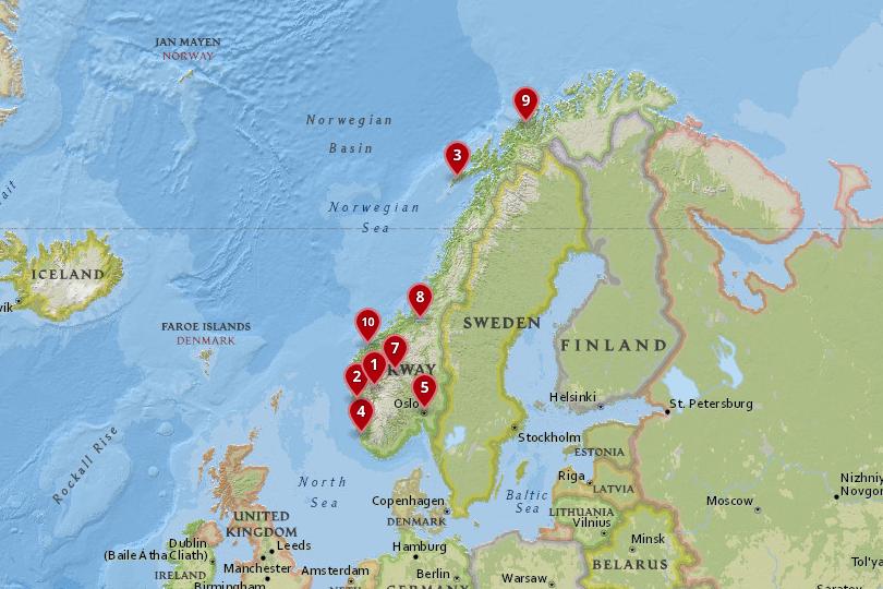 تشكلت المناظر الطبيعية الجبلية في النرويج في الغالب من أصل كاليدونيا ، عصر بناء الجبال منذ حوالي 390 مليون سنة ، وتُعرف سلسلة الجبال التي تمر عبر شبه الجزيرة الاسكندنافية بالجبال الاسكندنافية ، والصخرة التي تحتلها النرويج هي جزء من درع البلطيق الذي أنه يحتوي على أقدم التكوينات الصخرية في قارات العالم و القارة الأوروبية، وتُظهر الخريطة النرويج والدول المحيطة بها ذات الحدود الدولية والعاصمة الوطنية أوسلو وعواصم المحافظات والمدن الرئيسية والطرق الرئيسية والسكك الحديدية والمطارات الرئيسية .