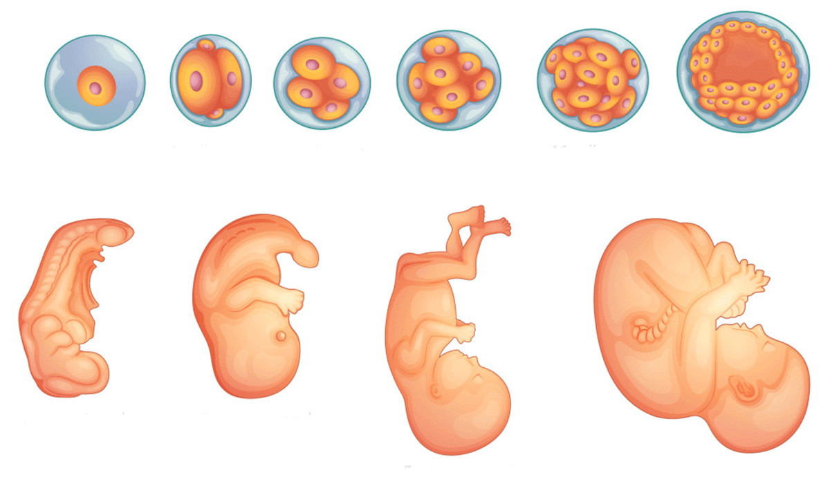 | الأسبوع الثالث (الاخصاب) | و يتم عملية إخصاب البويضة بواسطة الحيوان المنوي و زرع البويضة داخل الرحم ويتم اندماج البويضة و الحيوان المنوي بداخل إحدى قناتي فالوب لإنتاج البويضة الملقحة حيث تحتوي البويضة على 46 كروموسوم ( 23 كروموسوم من الأم، و 23 كروموسوم من الأب ) و تبدأ البويضة المخصبة في الإنقسام. |