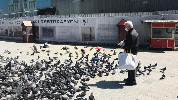 تصطف أسراب الحمام أمام الجامع الأزرق التاريخي في ميدان أمينونو في إسطنبول بانتظار وليمة طعامها اليومي المتأخرة، يطول بها الانتظار والسكون قبل أن يصلها الفرج من يدي رجل يرتدي قناعه الواقي من فيروس كورونا لينثر أمامها حفنات العلف.