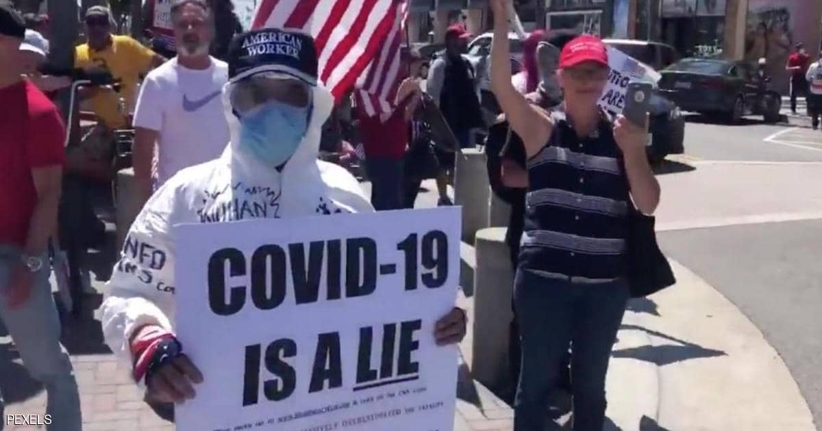 ودعا هذا المتظاهر في لافتة كان يحملها إلى إلغاء إجراءات الإغلاق، قائلا إن “كوفيد-19 كذبة”.