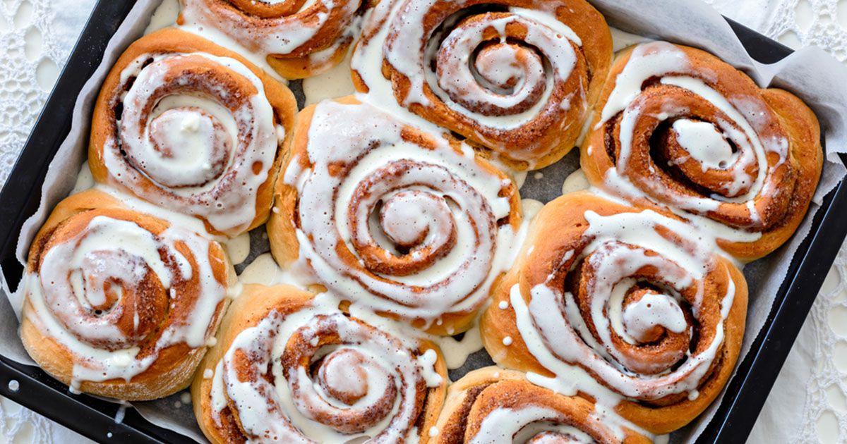 6- أنثري مزيج السكر والقرفة على العجينة ولفّيها على شكل رول. قطّعي العجينة إلى أقسام متساوية الحجم وضعيها في صينية الفرن. أدخلي الصينية إلى الفرن لـ25-30 دقيقة حتى تنضج العجينة.
