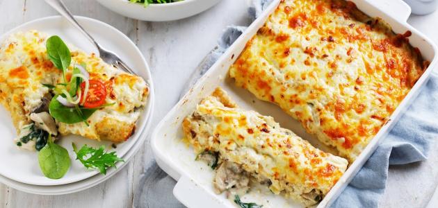 - يوضع الحشو، ثم يُلف الكريب في صورة اسطوانات متوسطة الحجم، ويُقدم مُزين بشرائح البصل الأخضر والجبنة البارميزان.