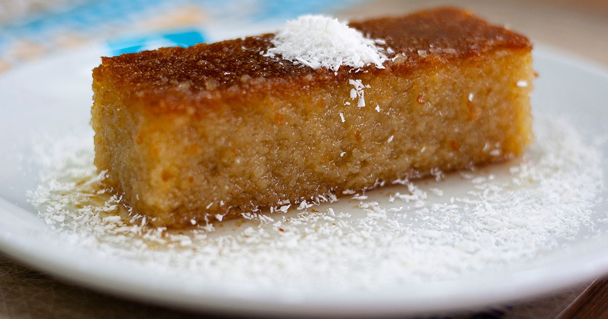 6- ارفعي الصينية من الفرن، اسقيها بالقطر بعد تقطيعها. زيني الوجه بالكمية المتبقية من جوز الهند ثم قدميها على سفرتك.
