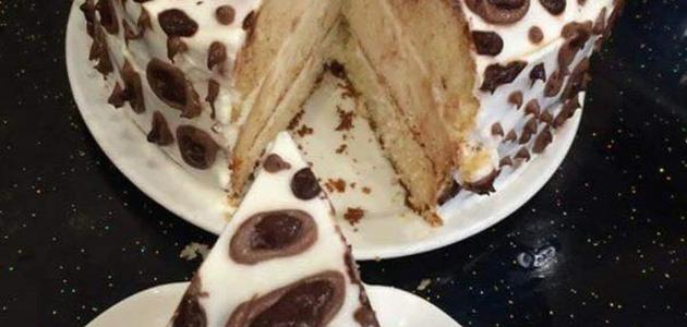 - فرد نصف كمية الخليط على الطقة الثاني، أما الباقي فيُضاف إليه الكاكاو ويُخلط جيدًا، ووضعه على الطبقة الاخيرة على شكل نقاط وعمل أشكال تشبه جلد النمر، وتغميق لونها باستخدام الكاكاو بحيث يكون اللون متباينًا ما بين الفاتح والغامق.