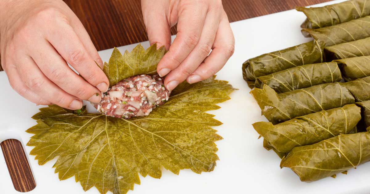 4- ضعي القليل من الحشوة على ورقة عنب ولفّيها باحكام. رصي الحبة في القدر.