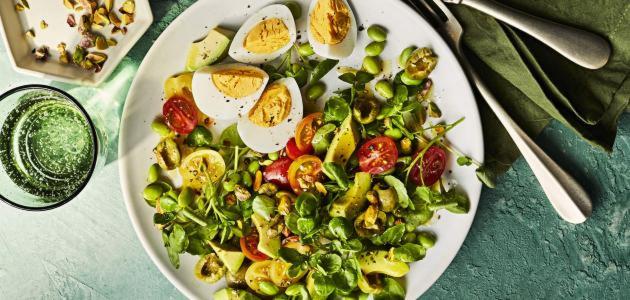 - يُوزع كل من البيض والأفوكادو والطماطم الكرزية والزيتون والفستق على الطبق بشكل متساوي.
