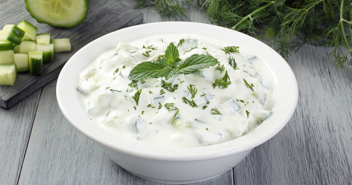 1- في وعاء، ضعي اللبن الزبادي، زيت الزيتون، عصير الليمون الحامض، الملح، الفلفل الأسود والنعناع. أخلطي المكونات حتى تتداخل.