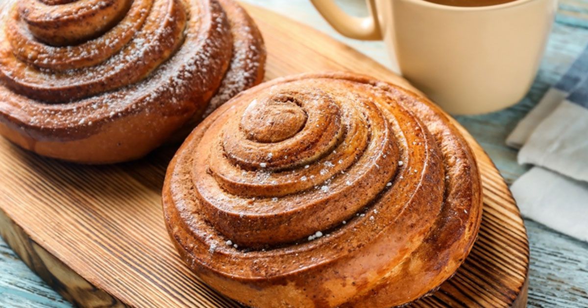 5- بواسطة النشابة، إفردي العجينة على سطح العمل المنثور بالدقيق. إدهنيها بمزيج القرفة والسكر ثمّ لفّيها على شكل رول.