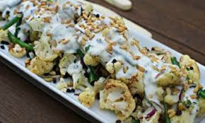 - نسكب صلصة الطحينة على قطع القرنبيط ونرش حبات الرمان والبقدونس المفروم والصنوبر .