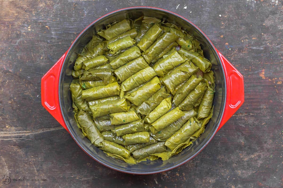 كرر وضع الأوراق من خلال وضعها في طبقات في القدر حتى تنفد أوراق العنب ، يمكنك تبديل اتجاه الأوراق في الوعاء للمساعدة في إبقاء كل شيء مطويًا بعناية .