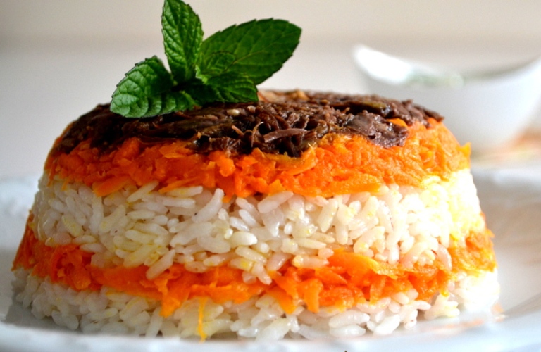 5- نرص قطع اللحم في قعر القدر، ونبشر كمية الجزر ونضع نصفها فوق اللحم، ثم نضيف نصف كمية الأرز المنقوع بالماء الفاتر، ثم نضع الكمية المتبقية من الجزر المبشور، ثم الكمية المتبقية من الأرز ونضيف مرق اللحم بحيث يغمر الأرز تماماً .