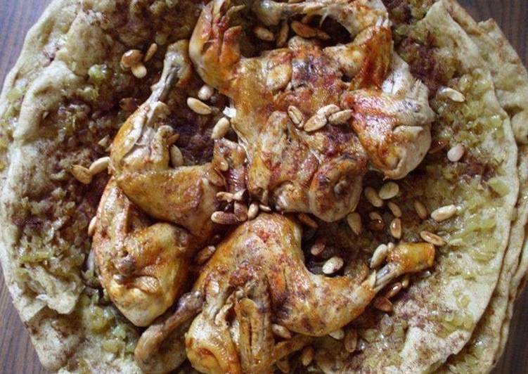 اضيفي البصل فوق خبز الطابون. حمّريه من ألأعلى حتى يصبح ذهبي اللون. أضيفي الصنوبر المقلي ثم أعيدي الكرّه بوضع طبقه من الخبز المبلل بمرق الدجاج ثم يتم اضافة البصل حتى تنتهي كمية البصل. لا تنسي تزيين الطبقات بالصنوبر.