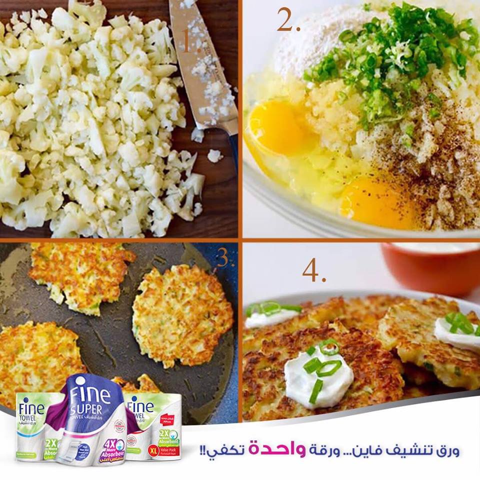 نقطع القرنبيط وردات ونسلقها ربع ساعة مع ملح وفلفل ورشة كمون.. بعدين نشيلها ونفرمها بالسكينة مع التوم ونقلبها مع نص كباية الدقيق والبصل الأخضر والبيض ورشة ملح وفلفل وكمون والمسترد.