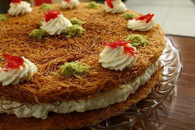 ترفع الكنافة عن النار وتترك لتبرد قليلاً ثم تغطى بطبقة متساوية من القشطة، ثم ينثر فوقها طبقة من عجينة الكنافة المتبقية.