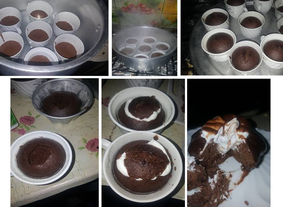الطريقه: إضافة المكونات الجافة فى إناء.. ونخلط جيدا ثم يصب اللبن والزيت.. ونخلط جيدا.. ونضع الخليط فى المجات و الفناجين الفخار او الزجاجية في حلة حمام مائي على بخار مية عالنار لمدة نصف ساعة لحد ماتستوي.