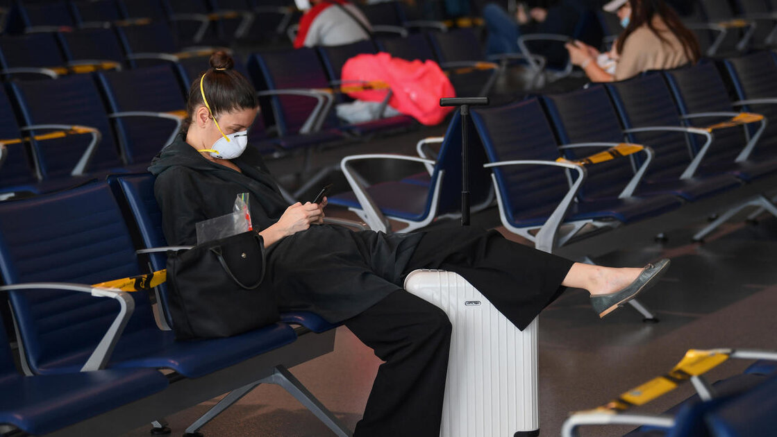 مسافرون متوجهون إلى فرانكفورت في انتظار طائرتهم في مطار دبي الدولي في 6 نيسان/ابريل 2020