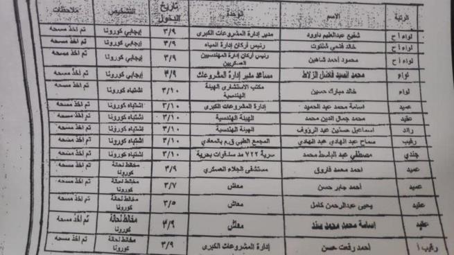 وحسب المصدر، شملت قائمة العسكريين المصريين الذين ثبتت إيجابية عيناتهم معملياً لفيروس كورونا، كلاً من: “مدير إدارة المشروعات الكبرى في الهيئة الهندسية للجيش، اللواء أركان حرب شفيع عبد العليم داوود، ورئيس أركان إدارة المهندسين العسكريين، اللواء أركان حرب محمود أحمد شاهين، ومساعد مدير إدارة المشروعات في الهيئة الهندسية، محمد السيد فاضل الزلاط، فضلاً عن 11 آخرين من كبار العسكريين المشتبه في إصابتهم، من المخالطين للحالات الإيجابية”.