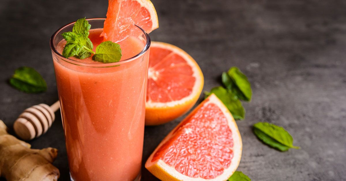 1- بواسطة عصارة الفاكهة، استخرجي عصير الجريب فروت واسكبيه في إناء.