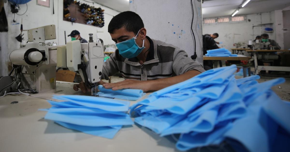 في جولة سريعة بين ماكينات الخياطة يلقي حسن شحادة كلمات تحفيز وتشجيع للعاملين داخل مصنعه الواقع شمالي مدينة غزة، والذي يختص في إنتاج الكمامات والألبسة الطبية.