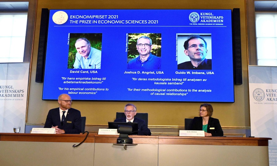 ستوكهولم: قالت الأكاديمية الملكية السويدية للعلوم الاثنين إن خبراء الاقتصاد ديفيد كارد وجوشوا أنجريست وجويدو إمبينز فازوا بجائزة نوبل للاقتصاد لعام 2021. وهذه هي آخر جوائز نوبل هذا العام ويتقاسم الفائزون بها مبلغا قدره عشرة ملايين كرونة سويدية (1.14 مليون دولار). (رويترز)