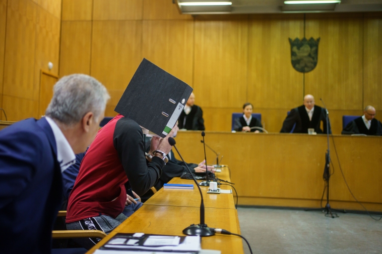 Iraqi defendant covers his face as he arrives for his verdict in a courtroom in Frankfurt