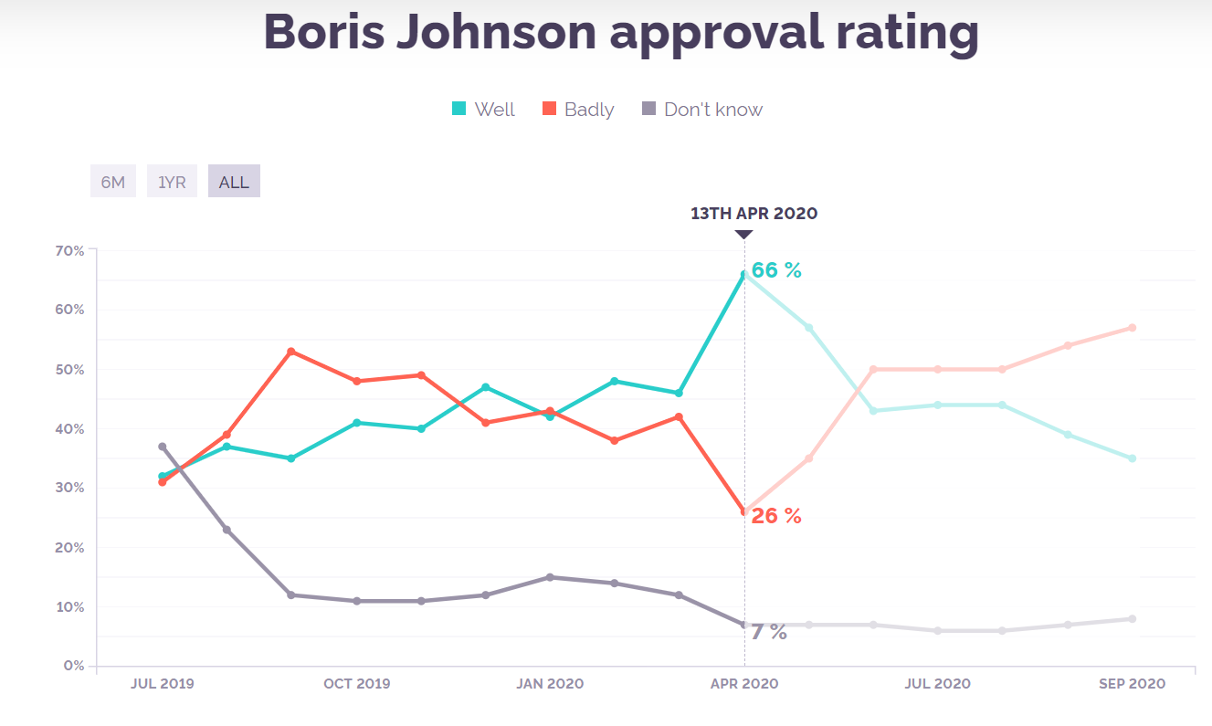 وتظهر البيانات أن جونسون حظي بأعلى تقييم لأدائه منذ توليه منصبه، بعد إعلانه عن إصابته بفيروس كورونا المستجد، في 27 آذار/ مارس الماضي، إذ بلغت نسبة الرضا في 13 نيسان/ أبريل 66 بالمئة، مقارنة 46 بالمئة في الاستطلاع السابق، بتاريخ 16 آذار.