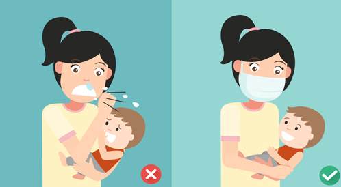 في حالة اصابة الام او الاب بالأنفلونزا عليهم ارتداء الكمامة، تحسبا لمنع انتقال العدوى للأطفال مع ضرورة الامتناع عن تقبيل الاطفال الصغار.
