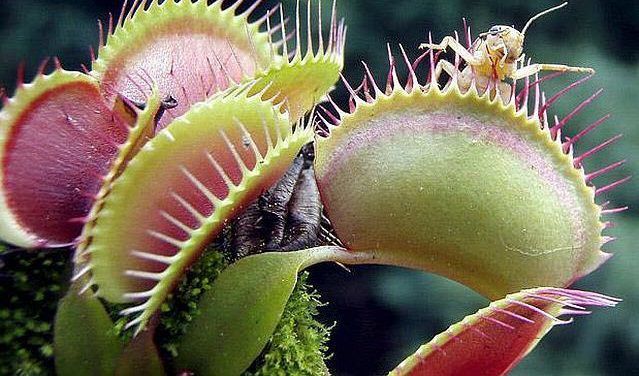 - خناق الذباب .. يقوم هذا النبات بالتقاط الحشرات بين اوراقه عن طريق الشعيرات الحساسة الموجودة بها فعند تلامس الحشرات لتلك الشعيرات تنغلق النباتات عليها و من ثم تقوم بهضمها كيف تصيد النباتات اللاحمة