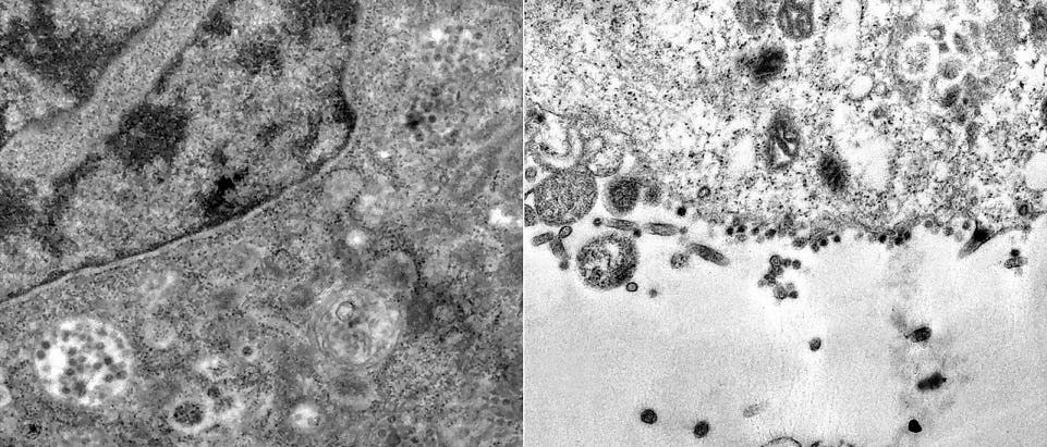 وشرحت الباحثة فييرا أيضاً، أن التجربة التي قامت بها المؤسسة للتعرف على أرض الواقع إلى كيفية تعامل الفيروس الحقيقي مع الخلية في جميع مراحله، أن كورونا يدخل إلى الخلية وينشر أجزاءه بداخلها في وقت لاحق، وأن صورا أخرى أظهرت الجسيمات المصابة وهي تغادر الخلية، بحسب ما يبدو في إحدى الصور التي تم التقاطها عبر ميكروسكوب إلكتروني، وهي أدناه.