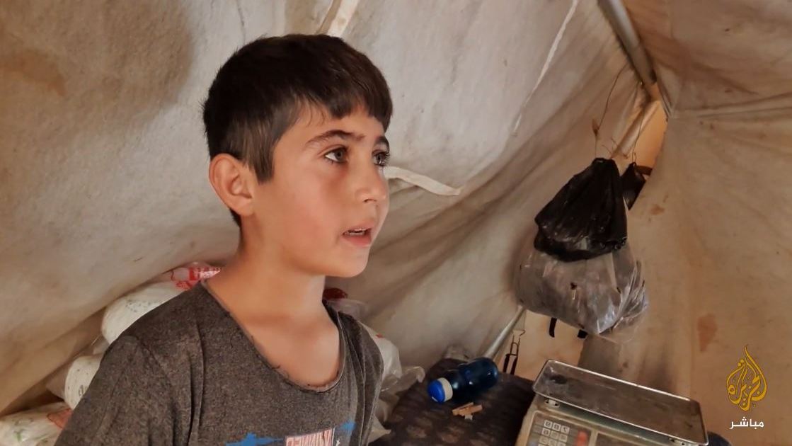 وقال الطفل الذي شبّ قبل الأوان، إنه يعيش مع عائلته مآسي النزوح منذ عامين.