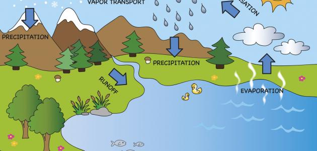 الدورة المائية الهيدروولوجية: يغطي الماء ما يقارب ثلاثة أرباع الكرة الأرضية، وهو مستمر في حركة طبيعية على شكل دورة لا نهاية لها حيث يتبخر جزء من مياه المتواجدة في المسطحات المائية وكذلك يتبخر جزء من المياه المتواجدة في سطح التربة وكذلك الأمر بالنسبة إلى أسطح النباتات إذ يتبخر جزء من المياه صاعداً إلى الأعلى على هيئة بخار ماء وبتواجد ظروف معينة في الجو يتكاثف هذا البخار من جديد ليعود إلى الأرض من جديد على صورة ترتسم مراراً في فصل الشتاء وغيره من الفصول، إذ تساقط بأشكال مختلفة؛ وتعرف هذه الدورة اللامنتهية بالدورة المائية.