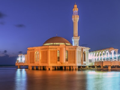 - يعرف بمسجد فاطمة الزهراء، أو مسجد الرحمة العائم كذلك يطلق عليه سكان المملكة بالعوام، وهو واحداً من أشهر المزارات السياحية التي لفتت أنظار السياح في مختلف البلدان والعقائد حيث يتمتع بموقع فريد في منتصف بحر جدة بالقرب من الكورنيش، إلى جانب التصميم المعماري الخارجي والداخلي التي تضيف إليه وحدات الإضاءة في الليل وحفيف ماء البحر جمالاً خلاباً.