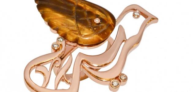 صياغة كلمة “حرية” بتصميم يشابه جناح طائر يوازي الحجر الكريم المنقوش أيضا”، ليشكل الاثنان معا” هيئة طائر بجناحين محلقين