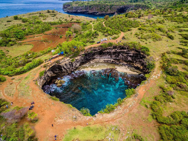 تعرف باسم ظاهرة البحر المكسور broken sea هي أحد أهم عوامل الجذب الفريدة من نوعها في نوسا بينيدا Nusa Penida من الظواهر الجيولوجية الباردة ، عند النظر إليه للمرة الأولى سترى قوس الطبيعية التي أنشأتها المنحدرات الطبيعية ثقب كبير في الهاوية الصخرية عبارة عن كهف قد أنهارت أرضية الكهف حتى كون الثقف والقوس الذي نراه اليوم يوجد بالجانب بركة طبيعية للسباحة .