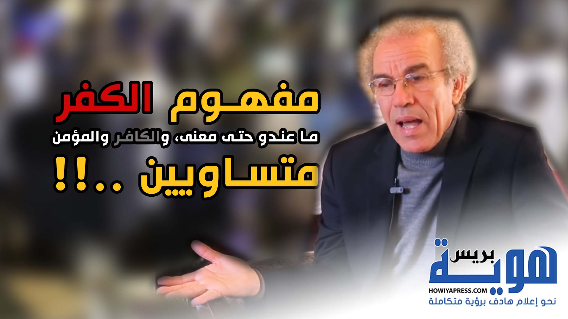 لأن في الدولة الحديثة مفهوم الكفر أو الكافر ما بقاش؛ ما عندو حتى معنى؛ لأن الدولة الحديثة قائمة على القوانين الوضعية وهاذيك القوانين لا الدستور ولا القانون الجنائي مافيهششيتمييز بين المؤمن وغير المؤمن، ولهاذا مفهوم الكافر بمعنى أنه إنسان سيء مبقاش اليوم، المؤمن وغير المؤمن متساويين اليوم في الواجبات ديال المواطنة والدولة عاطياهم كلهم “لاكارطناسيونال” إلى امشيتيالإدارات ما كيسولوكش على العقيدة ديالك. إذن معناه الناس اللي كيستعملوا الكفر والتكفير ناس غراب على العصر ديالناكيعيشوا في الماضي، خصهم يديروا مجهود باش يدخلوا معانا في العصر ديالنا. وإلاّ غيبقاو على الهامش، والعمل اللي كيديروه في التكفير هو عمل يؤذي ويسيء إلى غيرهم. لأنهم كاينتاقموا من الدولة الحديثة، لأنهم ما قدروش يهدموها باش يرجعونا عود تاني لمساوئ الدولة الدينية“.
