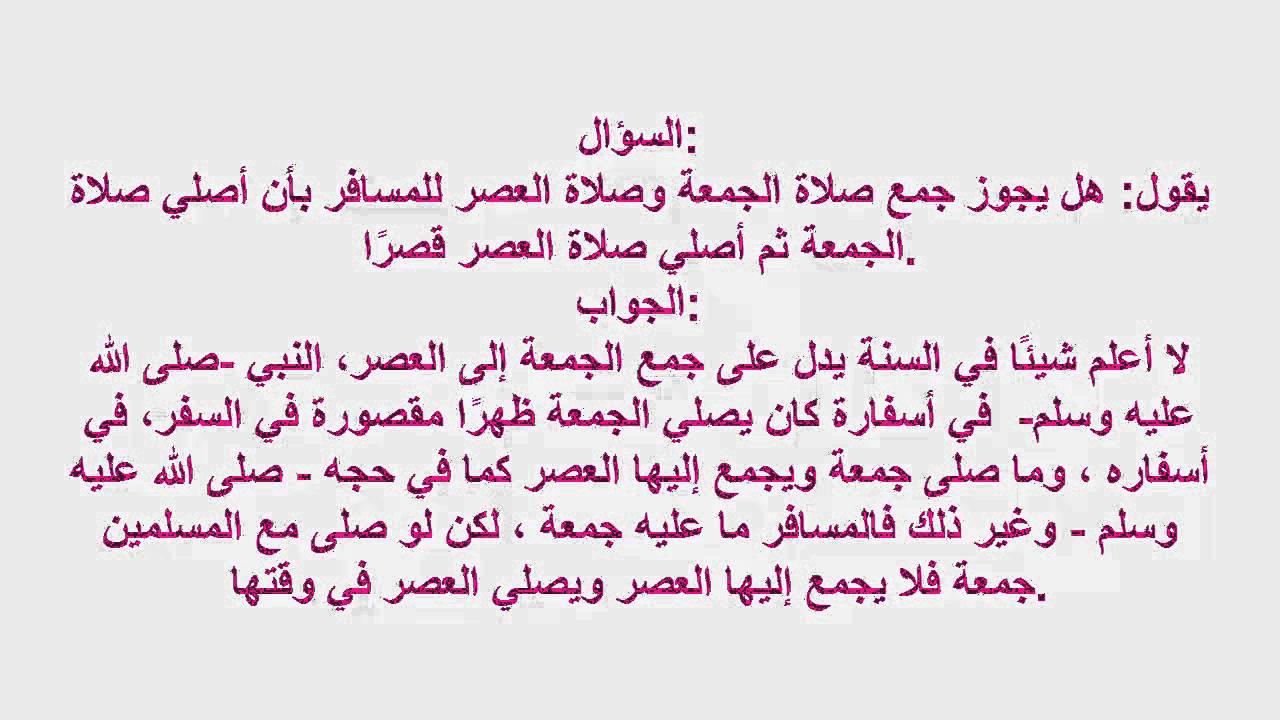 لكي نجيب على سؤال هل يجوز جمع صلاة الجمعة مع العصر، سنتحدث في هذا الأمر في عدة جوانب أولها في حالة كون المصلي مسافر فإن المصلي الذي على سفر حسب ما أجمع أهل العلم لا يجب عليه صلاة الجمعة بل يصلي صلاة الظهر المعتادة وإن كان سفره طويل فلا بأس بأن يجع للظهر العصر، في حين إن كان قد صلى الجمعة جماعة مع المصلين فلا يجب عليه أن يجمع لها العصر بل يصلي العصر في أي وقت آخر بعدما ينتهي من سفره، أما فيما يخص جمع صلاة الجمعة مع العصر فقد قال العلامة الشيخ ابن العثيمين أنه لا يجوز جمع صلاة الجمعة مع العصر في الحالات التي يجوز فيها جمع صلاة الظهر مع الجمعة، لكون صلاة الجمعة تختلف عن صلاة الظهر الإعتيادية ولا يجوز جمع أي صلاة لها، وهو ما كان الرأي الغالب للكثير من أهل العلم والمشايخ الذين منعوا جمع أي صلاة مع صلاة الجمعة لأي سبب كان، بينما الشافعية أجازوا ذلك عند نزول المطر الشديد وهو ما لم يوافقهم فيه المالكية والحنابلة.