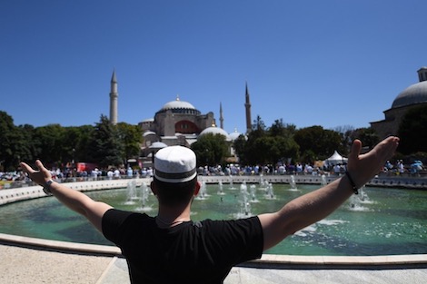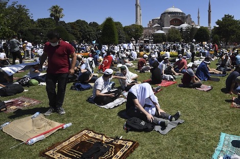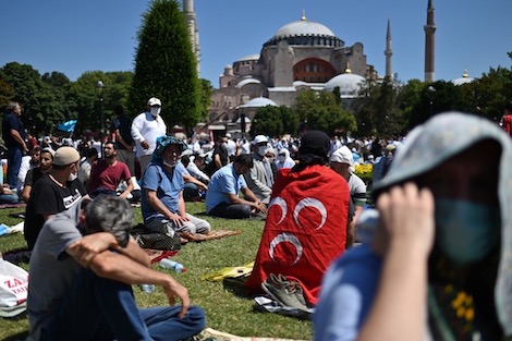 وحضر الرئيس التركي رجب طيب أردوغان وحلفاؤه المحافظون الإسلاميون الصلاة في المعلم الأثري الذي بناه الإمبراطور البيزنطي جستنيان الأول عام 537 كأكبر كنيسة في العالم المسيحي.