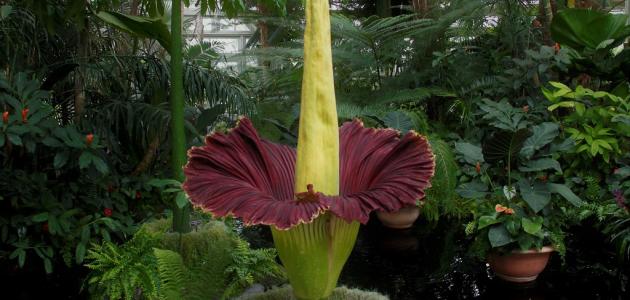 تعد زهرة أمورفوفالوس تيتانيوم أكبر زهرة في العالم على الإطلاق، وتنبت أكبر زهرة في العالم في بعض مناطق سومطرة في إندونيسيا وفي مناطق جاوة الغربية، حيث تنمو في الغابات المطيرة، كما تتم زراعة هذه الزهرة في العديد من الحدائق حول العالم، فضلًا عن زراعتها في بعض الجامعات، وتتميز هذه الزهرة بطولها العملاق الذي يصل إلى حوالي ثلاثة أمتار، وأوراقها العملاقة التي تحتوي على نسيج نباتي مجعَّد، ومن الناحية المظهرية فهي خضراء من الأسفل، وحمراء أو برتقالية الأوراق من الأعلى، كما تحتوي على بتلىة ضخمة في وسطها، وينبعث من الزهرة رائحة تشبه رائحة اللحم المتعفن، ولذلك يُطلق عليها في بعض الأحيان زهرة الجثة.[٢]